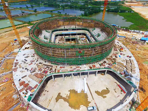 四會(huì)市體育中心主會(huì)館,長(zhǎng)軸110米,短軸100米,高度26.5米,項(xiàng)目總用地面積83317平方米,該項(xiàng)目鋼屋蓋為橢圓平面、大跨度單層網(wǎng)殼結(jié)構(gòu),鋼結(jié)構(gòu)用鋼量約1800噸。